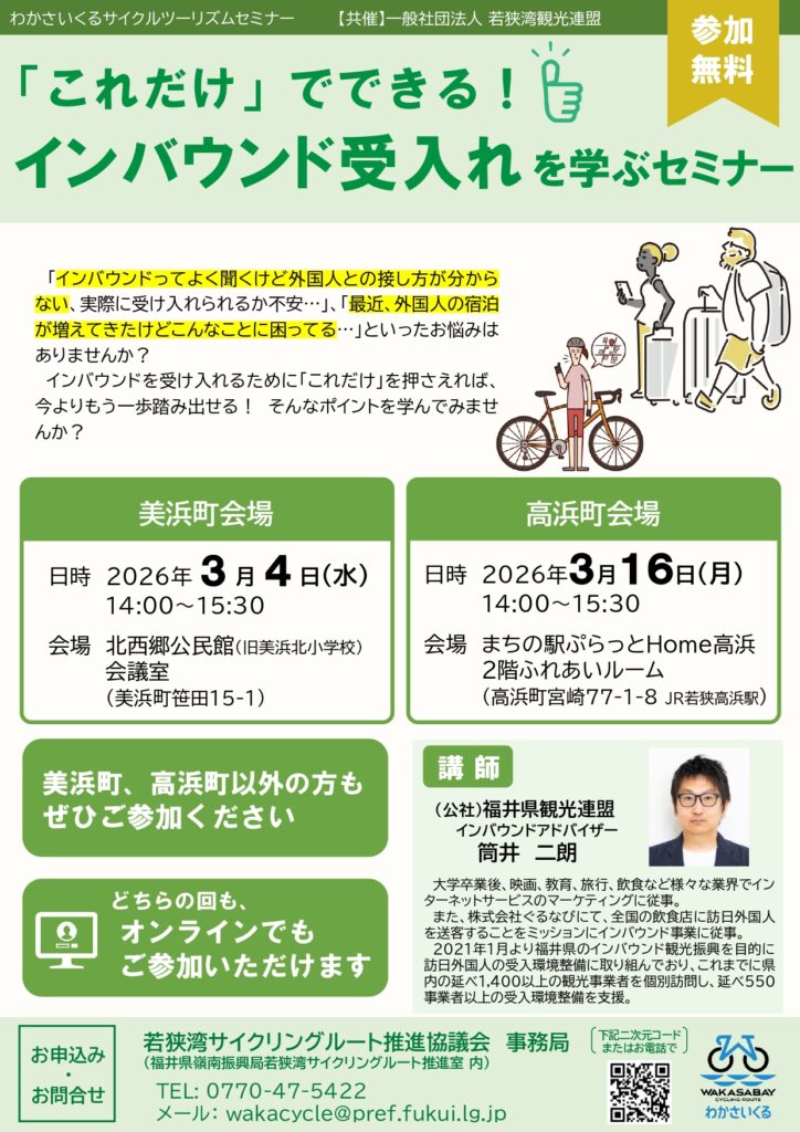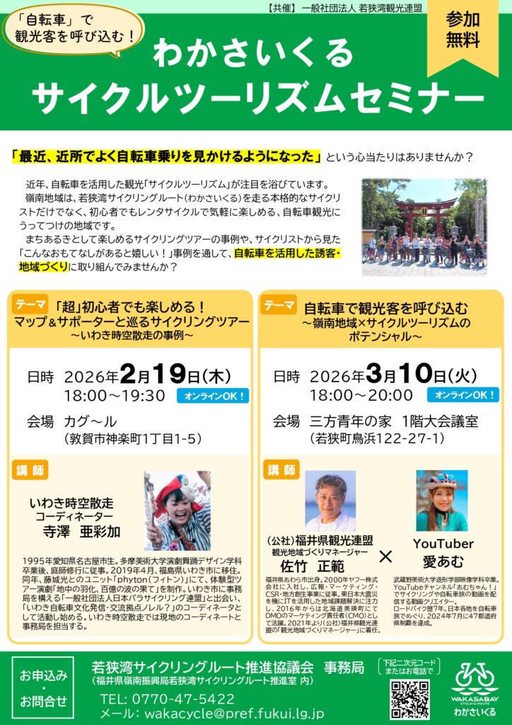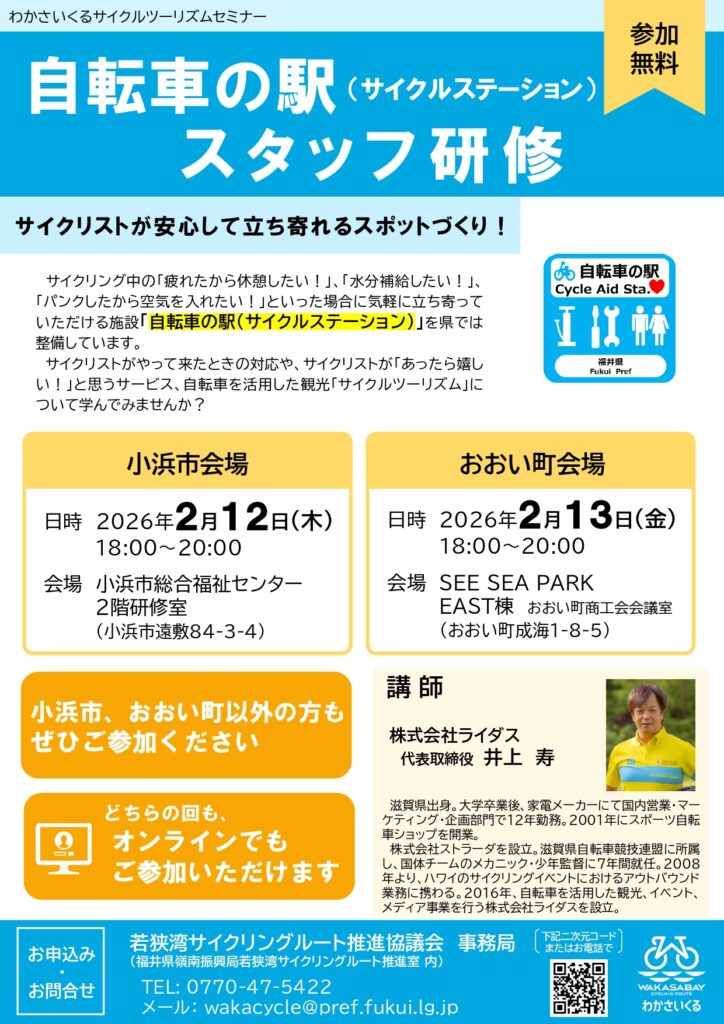 若狭湾サイクリングルート推進協議会より今年度実施予定のわかさいくるセミナーのご案内です。