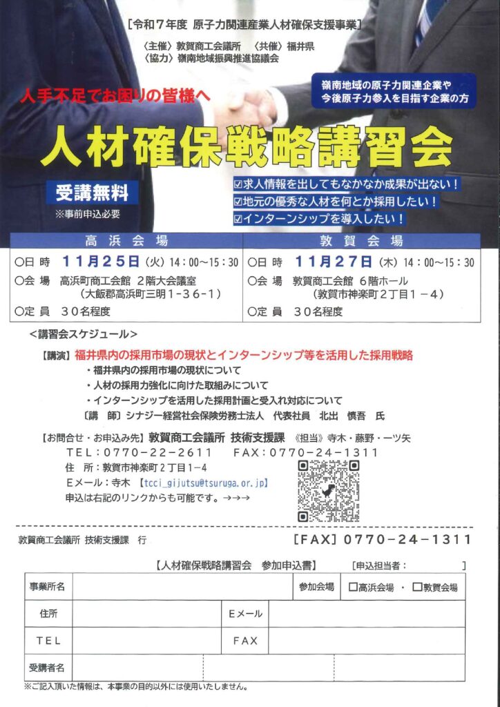 嶺南地域の原子力関連事業や、今後原子力参入を目指す企業の方向けに「福井県内の採用市場の現状とインターンシップ等を活用した採用戦略」についての講習会が開催されます。人手不足でお困りの皆さま、受講料無料ですのでこの機会にぜひご受講ください。