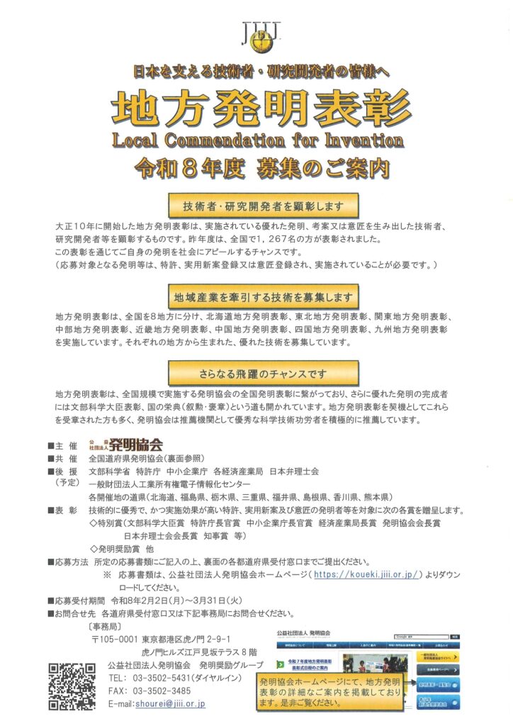 令和8年度地方発明表彰の募集が始まりました 2026 2/02 公益社団法人発明協会主催の令和8年度地方発明表彰の募集が始まりました。この表彰は、実施されている優れた発明、考案または意匠を生み出した技術者、研究開発者等を顕彰するものです。この表彰を通じてご自身の発明を社会にアピールするチャンスですので、ぜひご検討ください。 募集要項はこちら ⇒ 募集要項 お知らせ