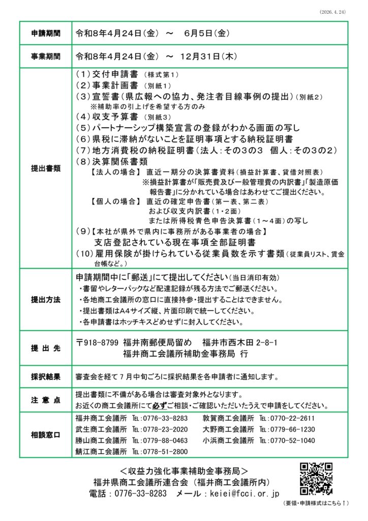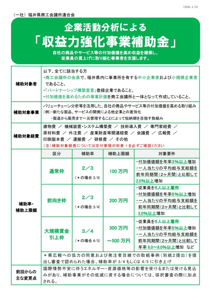 企業活動分析による収益力強化事業補助金のご案内 2026 4/27 第8回企業活動分析による収益力強化事業補助金の募集が始まりました。自社の商品やサービス等の付加価値を高め収益を確保し、従業員の賃上げに取組む事業者を支援します。詳しくは以下よりご確認ください。 企業活動分析による収益力強化事業補助金HP 補助金