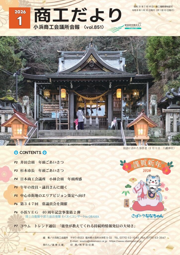 商工だより1月号を発行しました! 2026 1/14 今月は年頭のご挨拶や第347回常議員会の様子を掲載しています。お手元に届いた商工だよりをぜひチェックしてください! ※商工だよりは当所会員限定コンテンツです。 会員加入については0770-52-1040へお気軽にお問い合わせください。 商工だより