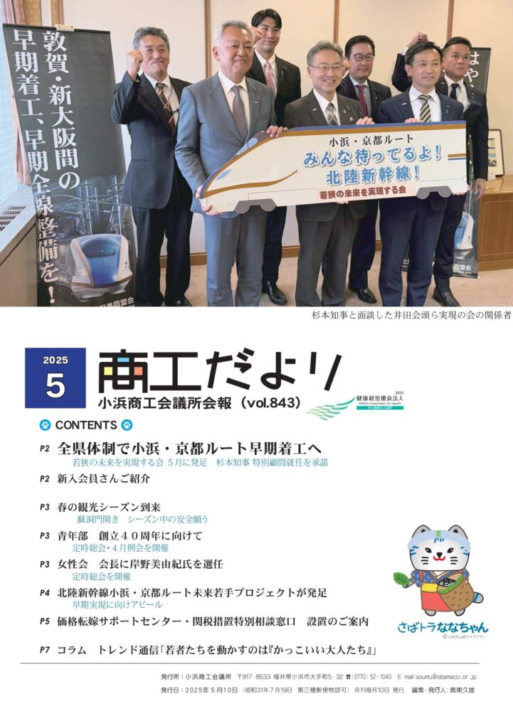 今月は、北陸新幹線小浜・京都ルート早期着工に向けて杉本知事を訪れた際の様子や、当所の青年部・女性会の活動について掲載しています。