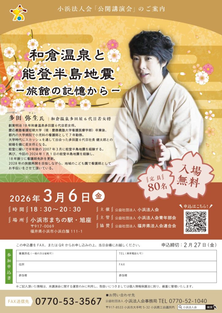 小浜法人会主催の公開講演会「和倉温泉と能登半島地震-旅館の記憶から-」が開催されます。2度の能登半島地震を経験した、和倉温泉多田屋6代目若女将の多田 弥生氏を講師に迎えご講演いただきます。