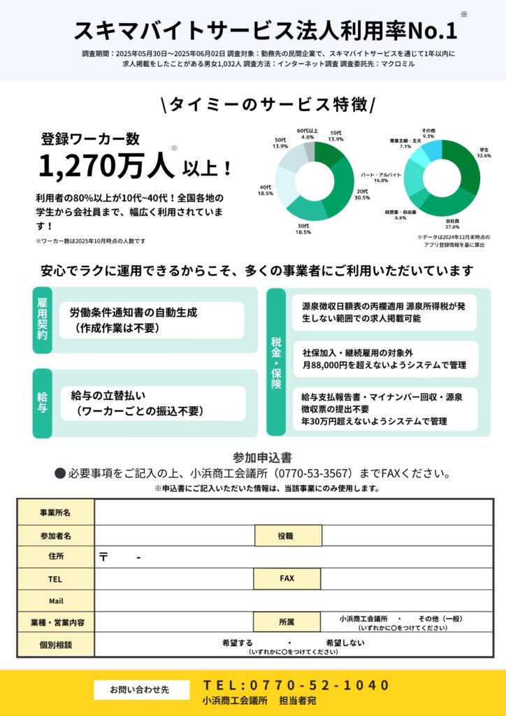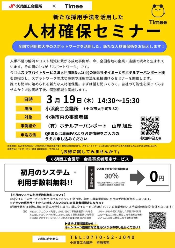 そのなかでも、スキマバイトサービス法人利用率No1の(株)タイミーと(有)ホテルアーバンポート様をお招きし、スポットワークの成功事例や活用方法について解説します。