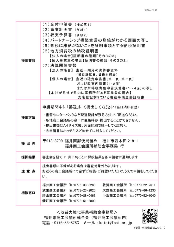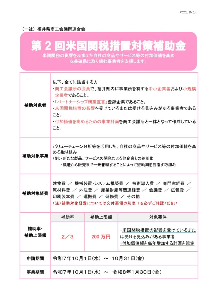 第2回米国関税措置対策補助金のご案内 2025 10/02 米国関税の影響を踏まえた自社の商品やサービス等の付加価値を高め、収益確保に取り組む事業者を支援します。 詳しくはこちらから ⇒ 福井商工会議所HP 補助金
