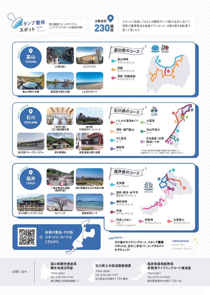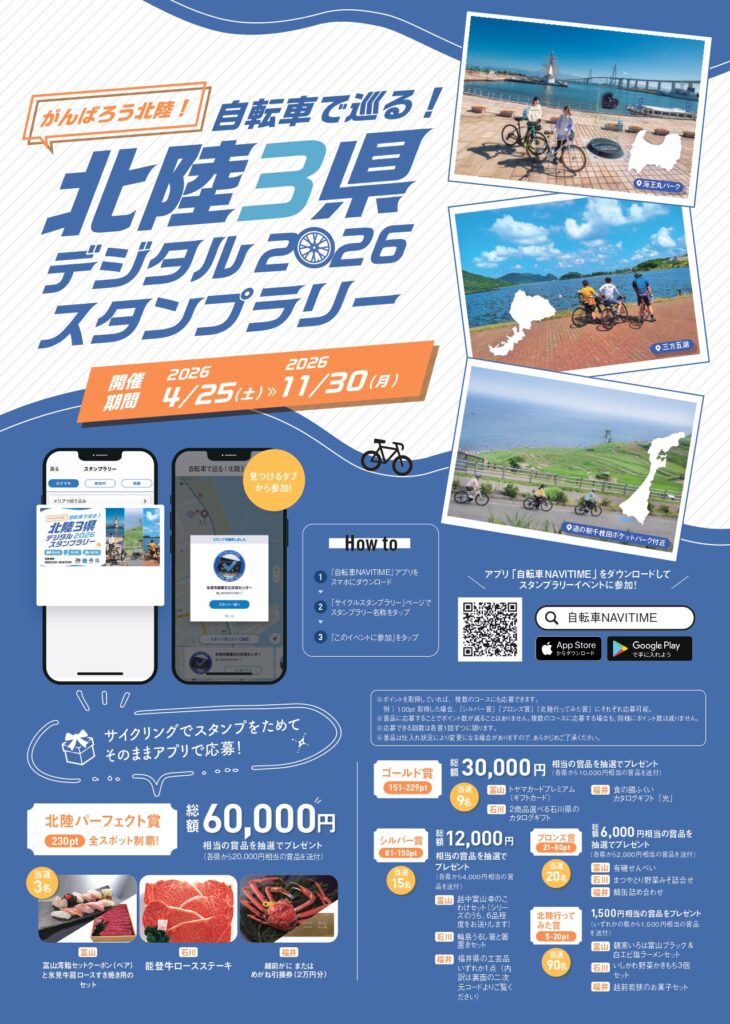 今年度も、北陸3県の連携事業の一環として自転車を使ったスタンプラリーが開催されます。ポイント数の合計に応じて抽選で各県の豪華賞品が当たります!
