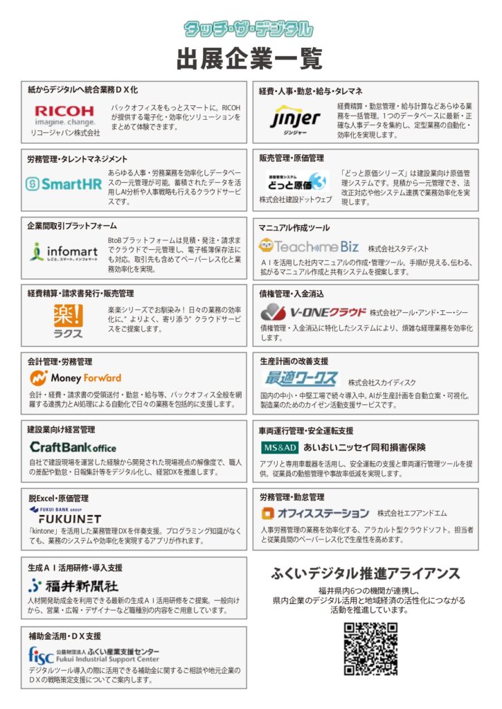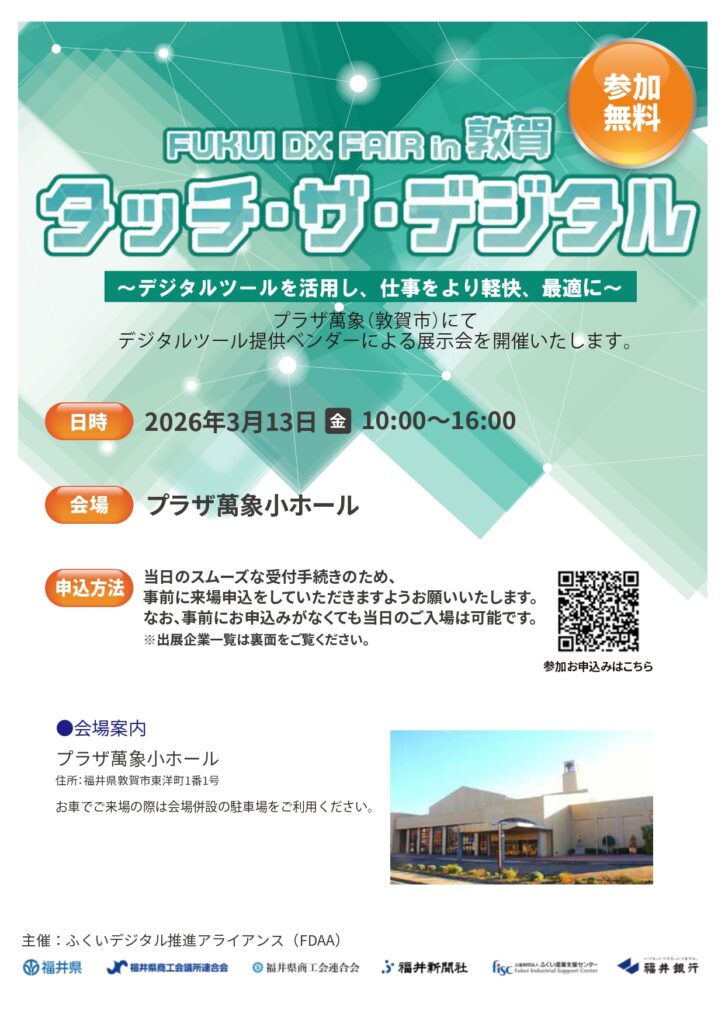 県内外のIT企業などが出展し、バックオフィスから現場まで様々な業務で活用可能な多種多様なデジタルツールを実際にご体験いただけます。業務のデジタル化に関するご相談も可能です。嶺南地域では初開催となりますので、是非ご参加ください。
